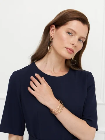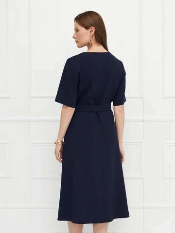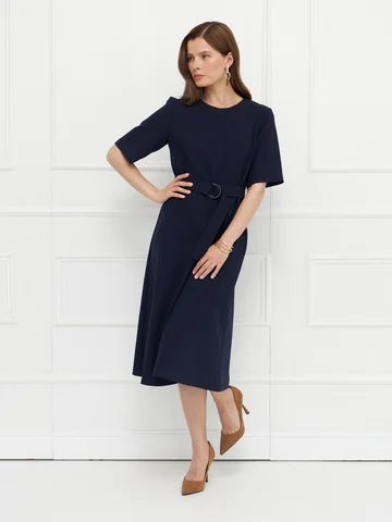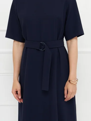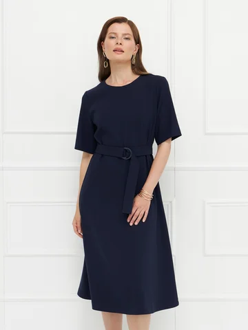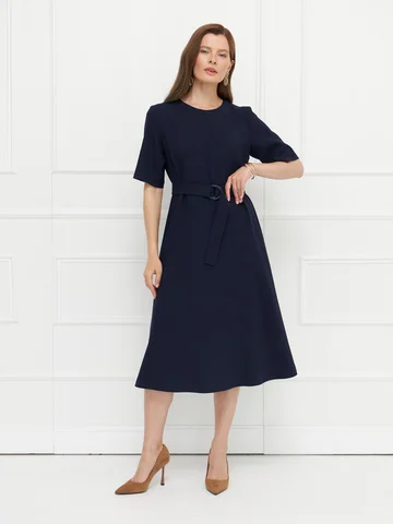 Платье синего цвета выполнено из плотного материала с эластаном, который комфортно облегает фигуру и держит форму. Прилегающий верх подчеркивает силуэт, а юбка миди слегка расширяется к низу, создавая сбалансированный и элегантный образ. Короткие рукава придают модели сдержанность, подходящую для деловых и повседневных случаев. Потайная молния на спинке сохраняет чистоту линии, а пояс с пряжкой акцентирует талию. Строгая и женственная модель для универсального гардероба.
