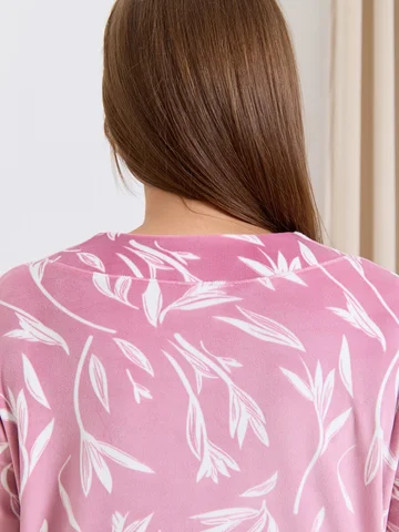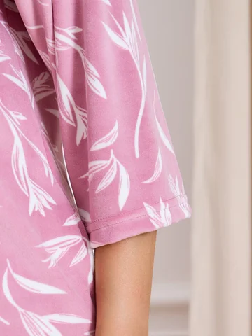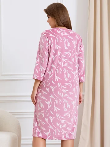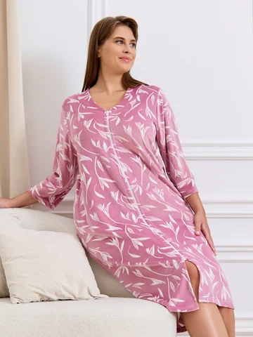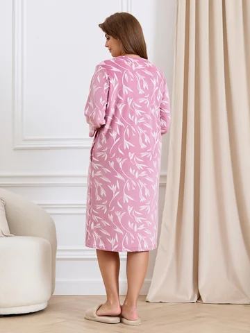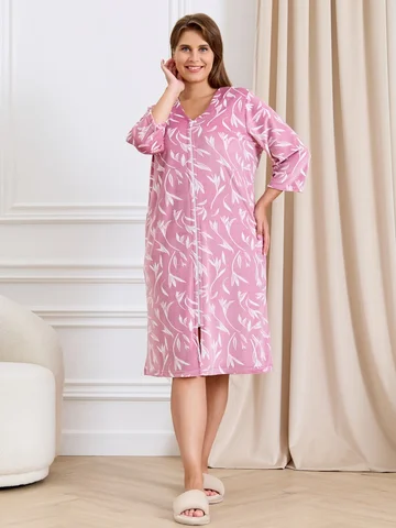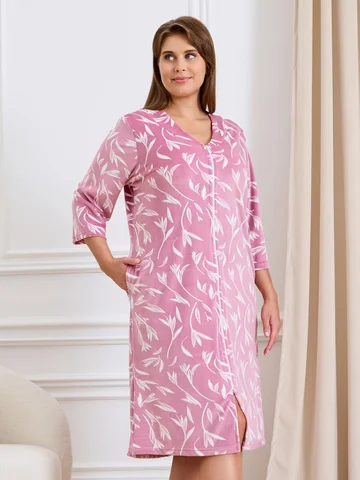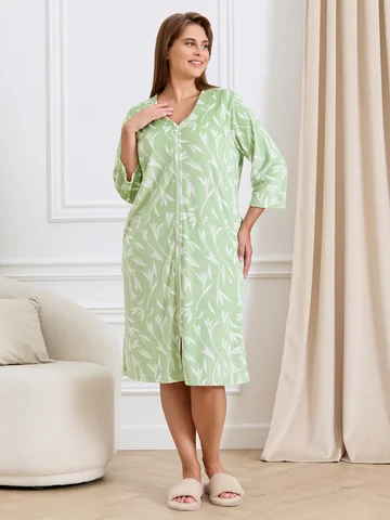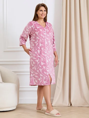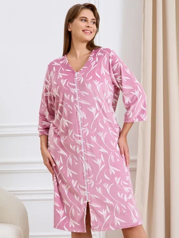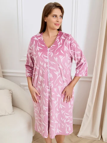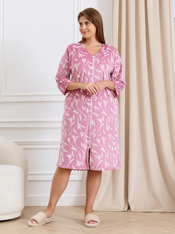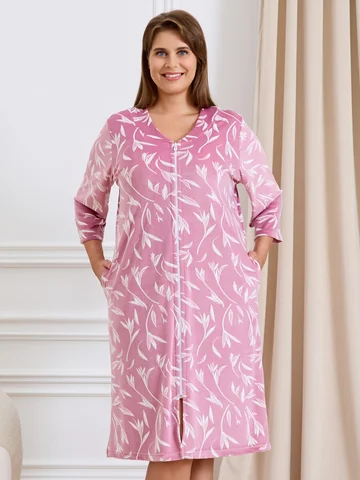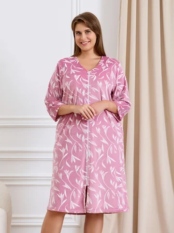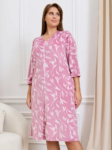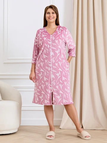 Халат женский из трикотажного полотна «велюр» с набивным рисунком, прямого силуэта, с втачными рукавами ¾ длины, горловиной обработанной втачной планкой фигурной формы, с карманами в боковых швах, центральной бортовой застежкой на тесьму «молния».