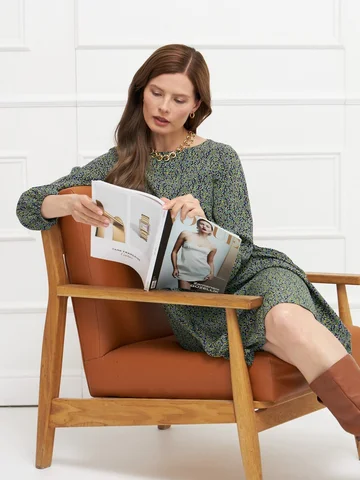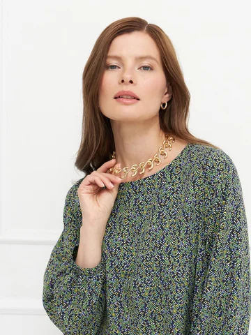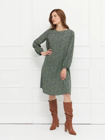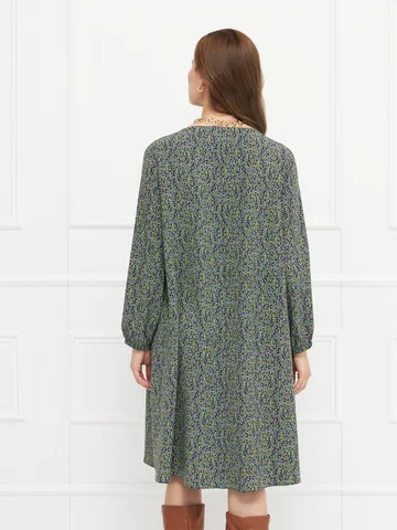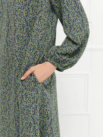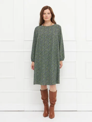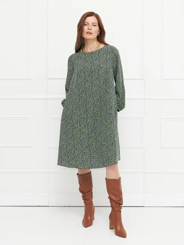 Платье свободного силуэта выполнено из легкой и комфортной ткани с мелким принтом, создающим деликатный акцент. Длина до середины колена делает модель универсальной для повседневной носки. Широкий низ придает образу легкость и движение. Рукава собраны по низу на мягкую резинку, формируя аккуратную линию. Карманы в боковых швах добавляют удобства. Платье легко вписывается в расслабленный городской стиль, оставаясь женственным и практичным.