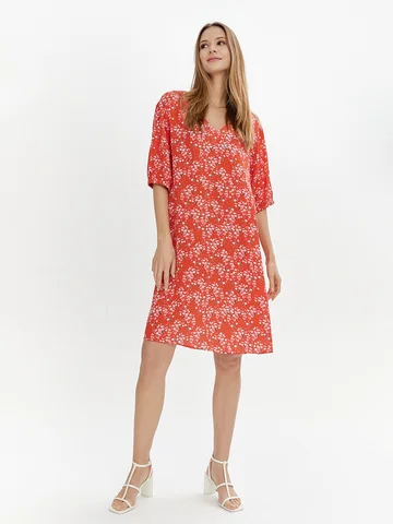 Женственность А-силуэта в этом коралловом платье длиной до середины колена довели до совершенства V-образной горловиной и объемными рукавами-фонариками. Модель сшили из вискозного материала с жаккардовой поверхностью и нежным цветочным мотивом.