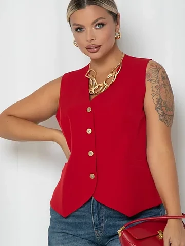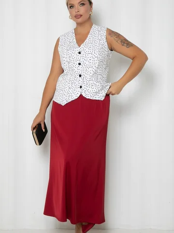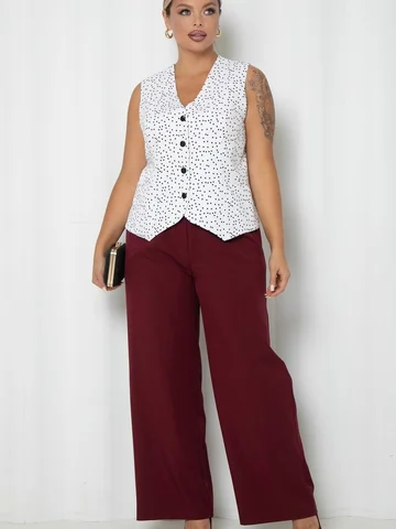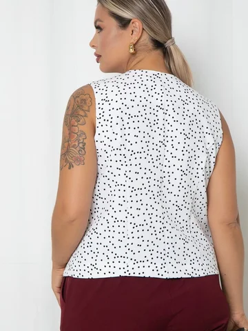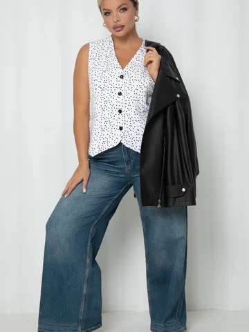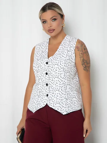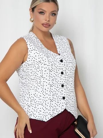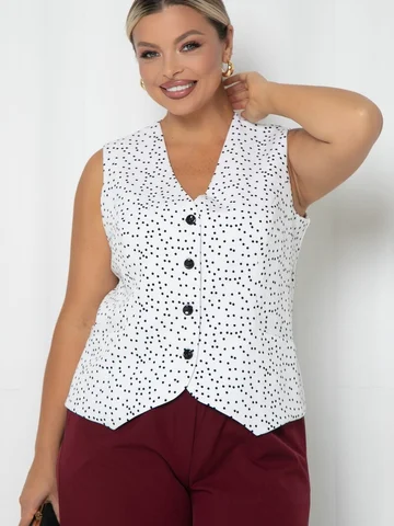 Жилет из костюмной ткани с принтом “горох“. Модель полуприлегающего силуэта с рельефами по переду и спинке. Спинка без подклада с фигурной обтачкой. Рельефы переда декорированы листочкой. Полочка двойная с фигурным низом. Застежка на пуговицы.