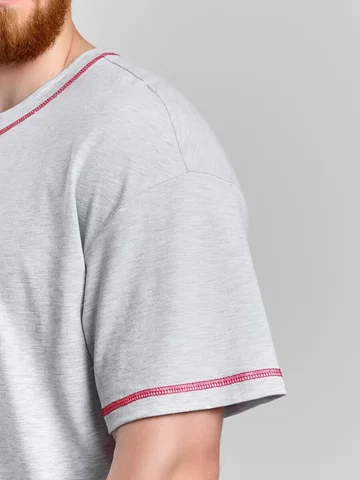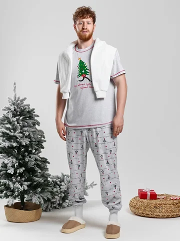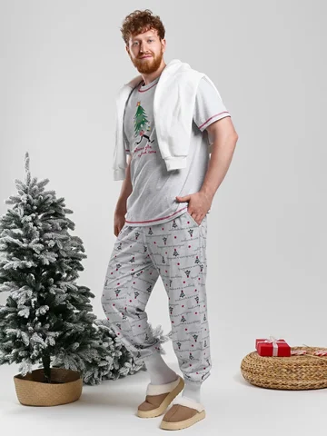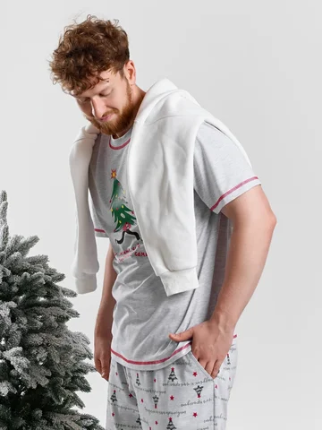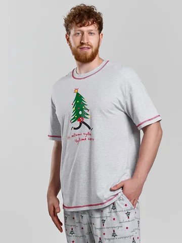 Костюм мужской из трикотажного полотна в комбинации двух видов: полотна "кулирка-кармеланж" и полотна "кулирка"с набивным тематическим рисунком на сером фоне , состоящий из футболки и брюк. Футболка - классического силуэта, свободного покроя, с приспущенным плечом, с втачными рукавами длиной до локтя, горловиной овальной формы, обработанной втачной планкой и принтом в центре переда. По шву втачивания планки настрочена декоративная (5-ниточная) отделочная строчка нитками контрастного цвета Подгибка низа рукавов и изделия так же выполнена с применением декоративной отделочной строчки. Брюки выполнены из полотна с набивным тематическим рисунком, длинные, умеренной ширины, прямые, на притачном поясе с эластичной тесьмй внутри и карманами в боковых швах.