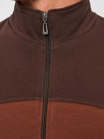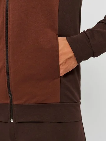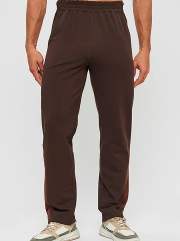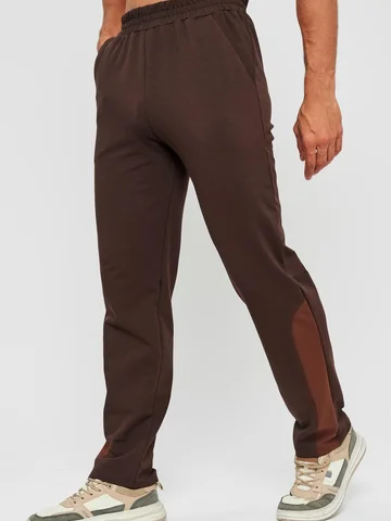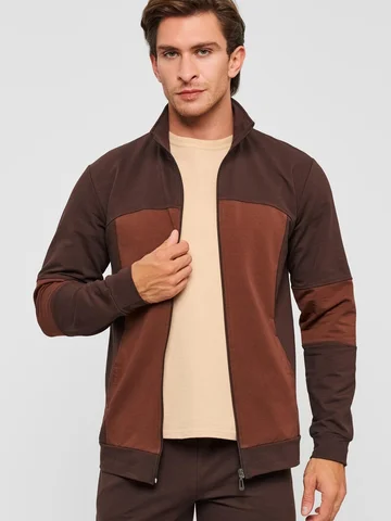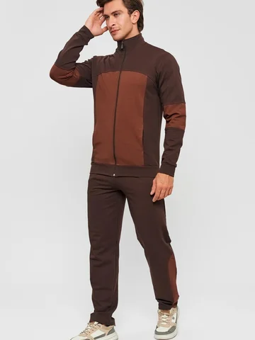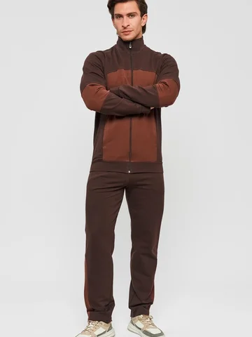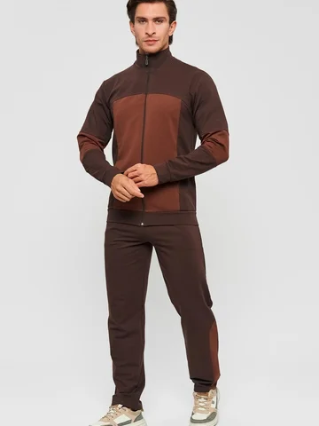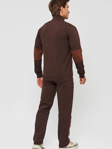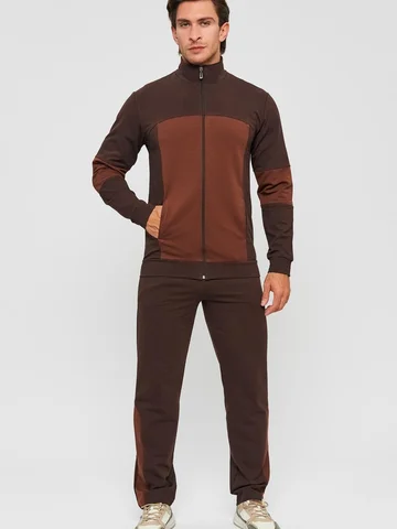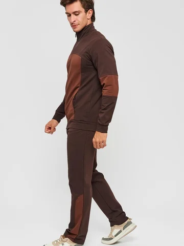 Мужской спортивный костюм из хлопкового трикотажа. В комплекте костюма куртка на манжетах и свободные прямые брюки. Воротник куртки - стойка, полочка и рукава выполнены оригинальным образом комбинацией тканей, застежка на молнии. Куртка и брюки с удобными карманами. Брюки на поясной резинке, выполнены из однотонного цвета. Модель костюма свободного покроя, не сковывает движений. Такой костюм прекрасно подойдет как для спорта, так и для отдыха.