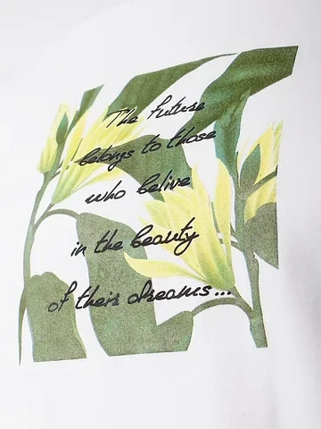 Особое внимание привлекает стильный принт в виде листьев и цветов с надписью, выполненный красками с устойчивым покрытием, который добавляет изделию оригинальности и позволяет выразить индивидуальность. Перевод надписи: The future belongs to those who believe in the beauty of their dreams - Будущее принадлежит тем, кто верит в красоту своей мечты.