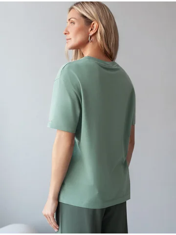 Футболка светло-оливкового цвета изготовлена из премиального хлопка с эластаном, она обеспечивает невероятное ощущение уюта и легкости. Натуральный материал сохраняет форму и цвет после множества стирок, обеспечивая долговечность изделия, а его высокая воздухопроницаемость создает ощущение свежести даже в течение долгого дня.