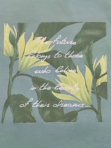 Особое внимание привлекает стильный принт в виде листьев и цветов с надписью, выполненный красками с устойчивым покрытием, который добавляет изделию оригинальности и позволяет выразить индивидуальность. Перевод надписи: The future belongs to those who believe in the beauty of their dreams - Будущее принадлежит тем, кто верит в красоту своей мечты.