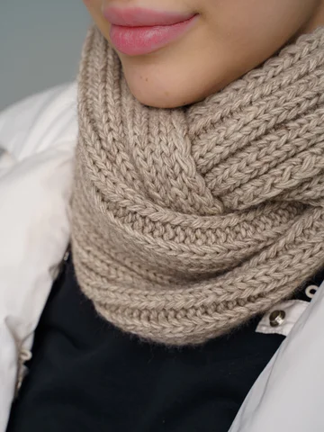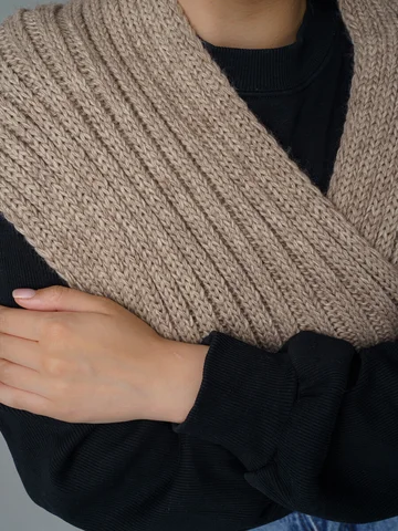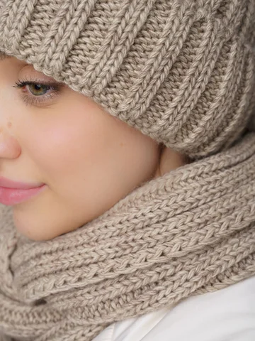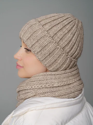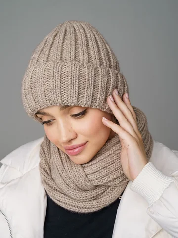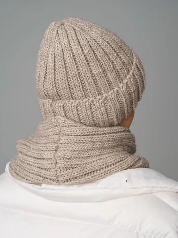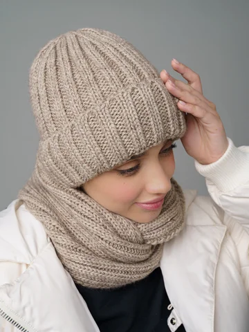 Зимний женский комплект: теплая шерстяная шапка-бини на флисе с снудом из 30% шерсти и 70% акрила, защищает до -20°C. Стильная вязка создает образ и защищает от ветра.
