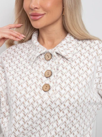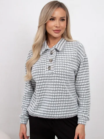 Комфортный джемпер свободного кроя из трикотажного полотна. Длинный втачной рукав со спущенным плечом присобран на манжету. Отложной воротник. Перед оформлен планкой с застежкой на петли и пуговицы. Низ на манжете.