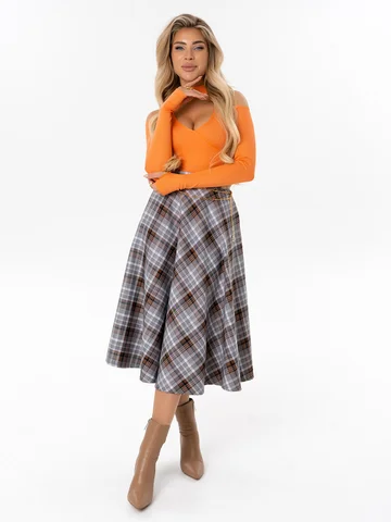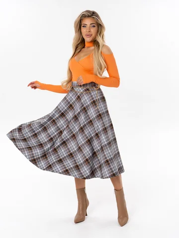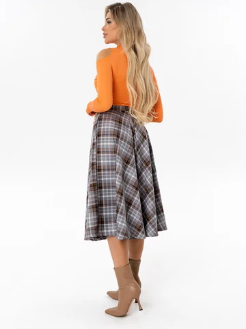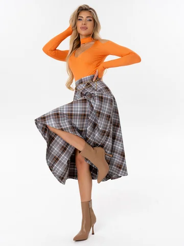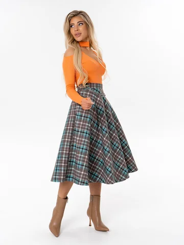 Юбка-трапеция в винтажном стиле смотрится игриво, немного наивно, но супер выразительно. Отрезной крой пояса выгодно подчеркивает талию, делая ее более изящной. Длина для высоких девушек будет миди, а для девушек миниатюрных – макси. Пышная клетчатая юбка в ретро-стиле особенно придется по вкусу любительницам классической моды. Шикарную пару юбке-солнцу составит шелковая блуза с бантом, трикотажная водолазка или базовая белая футболка. Карманы в боковых швах придают юбочке больше кокетства и женственности. А декоративная цепь с подвеской в районе талии будет служить украшением и притягивать взгляды. Застежка-молния, удобно расположенная сзади, позволит вам с легкостью надевать и снимать юбку. В такой юбочке вы можете пойти куда угодно: на работу, в кино с подругами, на свидание с любимым, и всегда будете выглядеть очаровательно. Состав: 50% полиэстр, 25% хлопок, 20% вискоза, 5% эластан Ткань: костюмная Длина изделия: 77 см Застежка: молния сзади Плотность ткани: средняя Карманы: в боковых швах Комплектность: украшение в виде цепи с подвеской входит в комплект