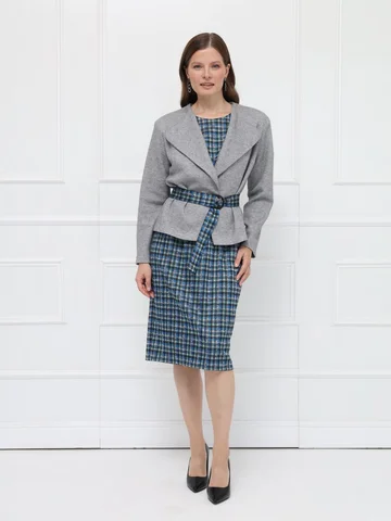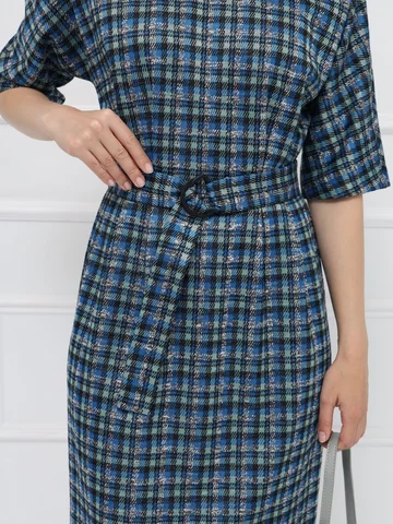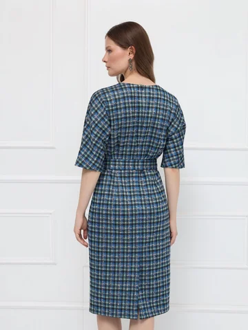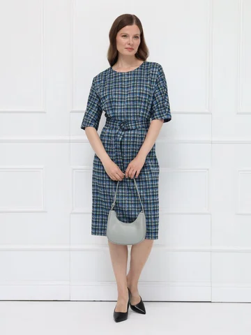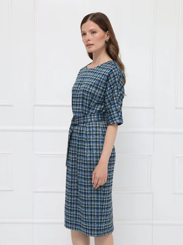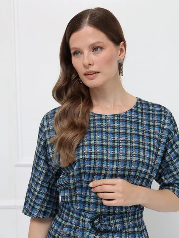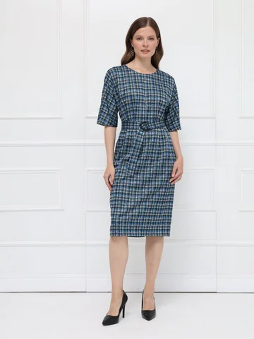 Элегантное платье полуприлегающего силуэта, идеально подчеркивающее фигуру. Цельнокроеные рукава длины 3/4 идеально ложатся под жакет или верхнюю одежду. Вытачки и мягкие застроченные складки создают аккуратный женственный силуэт, а пояс акцентирует талию. На спинке — изящная шлица и застежка-молния. Модель выполнена из мягкого трикотажа с мелким принтом «микроклетка» в благородной сине-серой гамме. Универсальная длина до середины колена делает платье подходящим как для офиса, так и для повседневных образов.