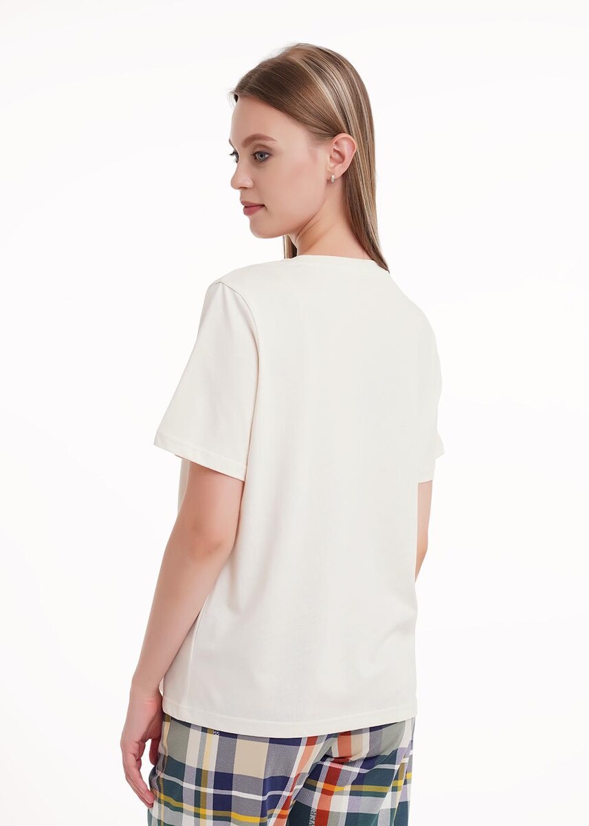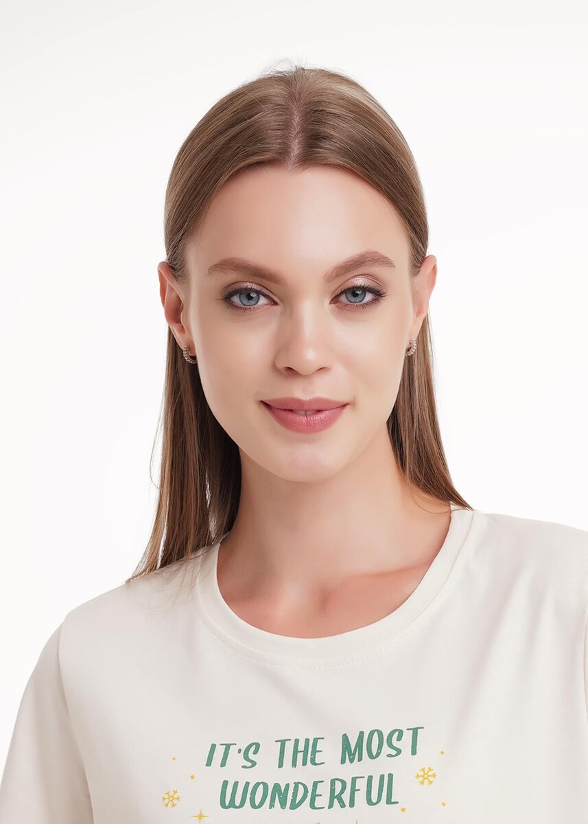 Домашняя футболка из хлопкового трикотажного полотна. Модель комфортного прямого силуэта с коротким втачным рукавом и круглым вырезом горловины украшена ярким новогодним принтом. Мягкая, дышащая, приятная к телу футболка прекрасно впишется в домашний гардероб и добавит в повседневность нотку зимнего уюта. Эта стильная удобная модель - отличный вариант как для отдыха дома, так и для подарка близкому человеку. Рекомендуется стирать в режиме «Деликатная стирка» при температуре до 30 градусов, температура утюжки до 170 градусов.