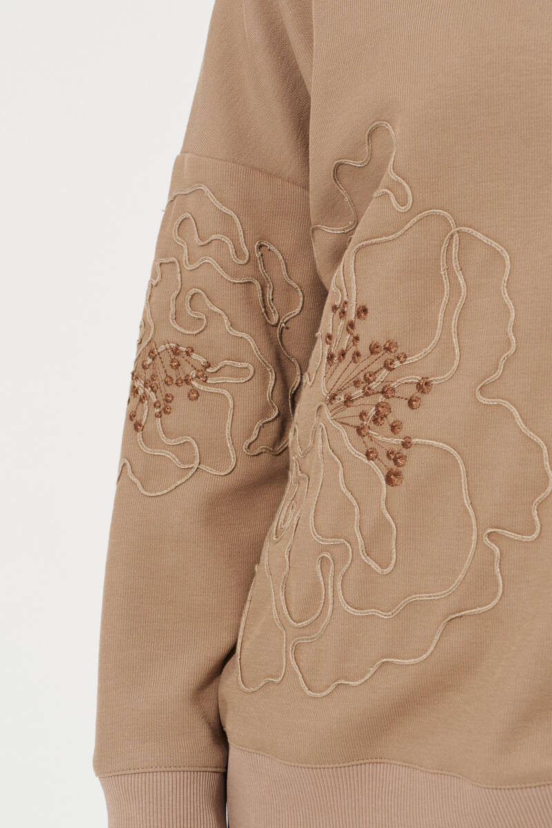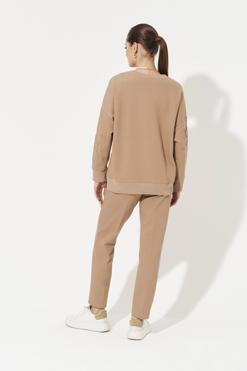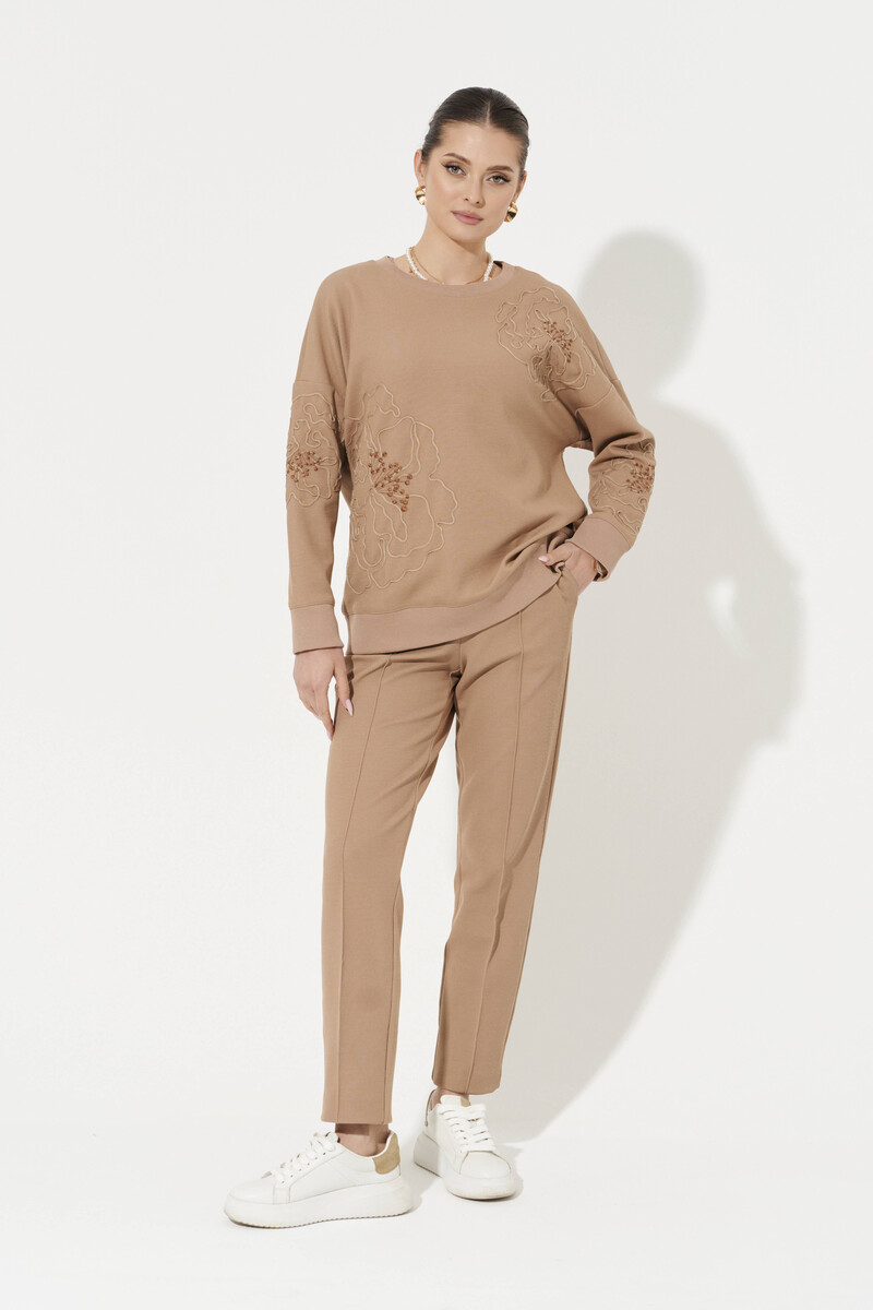 Джемпер женский из смесового трикотажного полотна с добавлением хлопка. Джемпер прямого силуэта для повседневной носки. Джемпер имеет по переду декоративную вышивку шнуром в виде цветов. По низу изделия имеется притачной слегка тянущийся пояс. Спинка прямая, без шва. Линия плеча спущена. Рукава втачные длинные, низ рукава обработан слегка тянущейся притачной манжетой. Горловина обработана притачной слегка тянущейся бейкой. Отличный вариант в прохладное время. Станет замечательным дополнением к вашему образу.