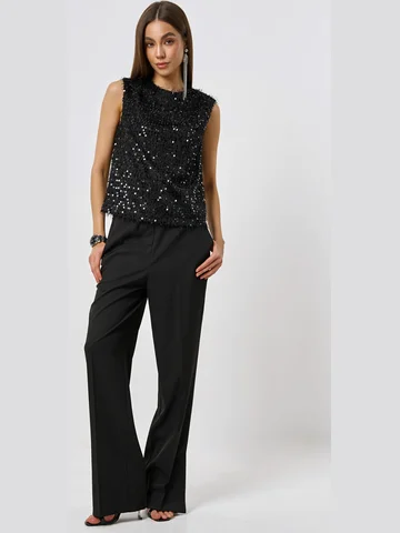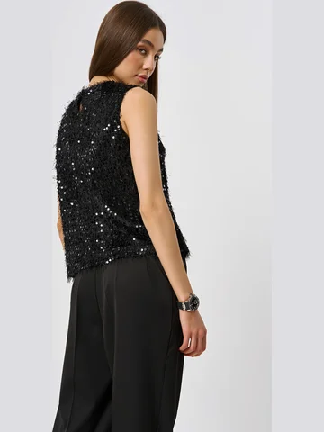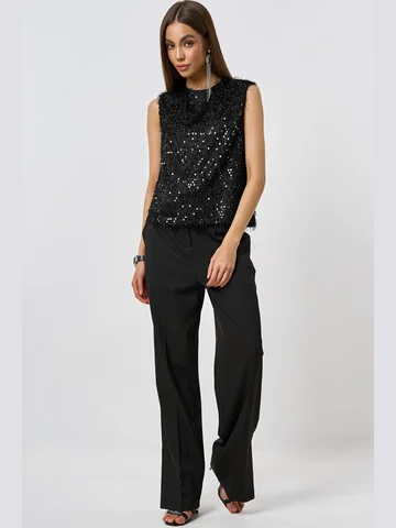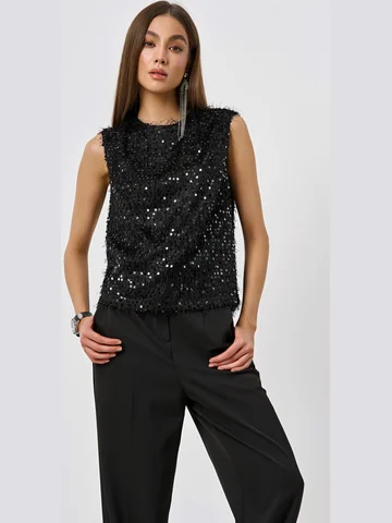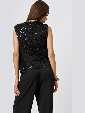 Особенности: Блузка прямого силуэта из трикотажа с пайеткой на подкладке. По спинке застежка на пуговицу.