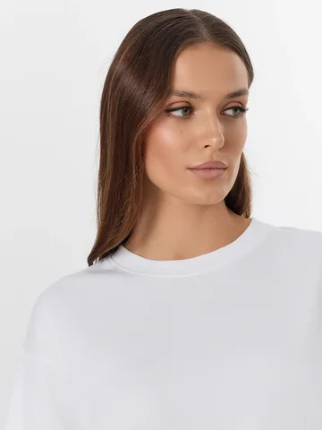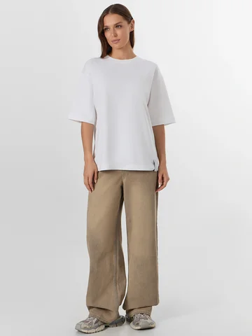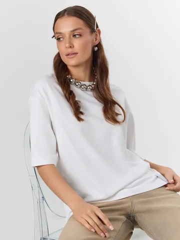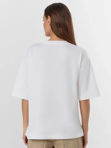 Белая футболка из линейки Premium Base — основа гардероба, где каждая деталь продумана для повседневного комфорта. Свободный силуэт со спущенным плечом и углубленной проймой обеспечивает свободу движений, не образуя складок в области подмышек. Мягкий интерлок с хлопком и полиэстером в составе сохраняет форму после стирок, не истончаясь и не теряя насыщенности белого цвета.
