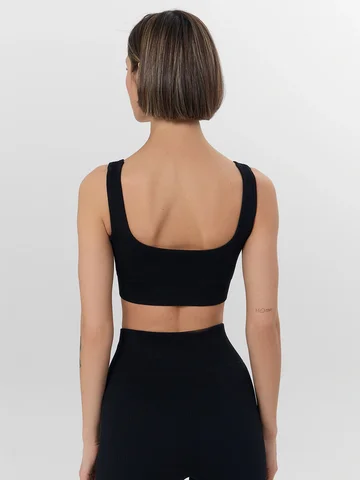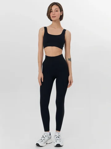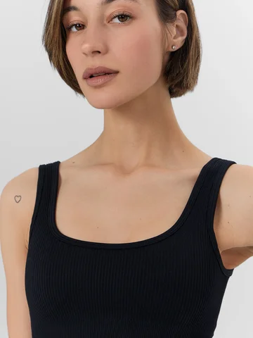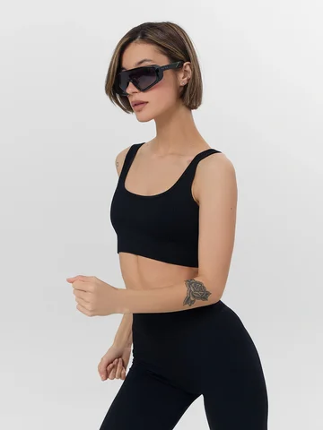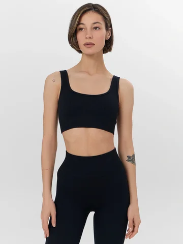 Черный женский спортивный топ с рельефным рубчиком создает элегантный силуэт для активного образа жизни. Облегающий крой и широкие бретели обеспечивают надежную поддержку во время тренировок. Горизонтальная горловина формы «каре» подчеркивает лаконичный дизайн модели. Изделие выполнено из трикотажного материала интерлок — мягкого, прочного и приятного к коже. Эта ткань отличается хорошей эластичностью и воздухопроницаемостью, что делает ее отличным выбором для тренировок и активного отдыха Дышащая ткань обеспечивает комфортный микроклимат, эффективно отводя влагу в течении занятий фитнесом, йогой или аэробикой.