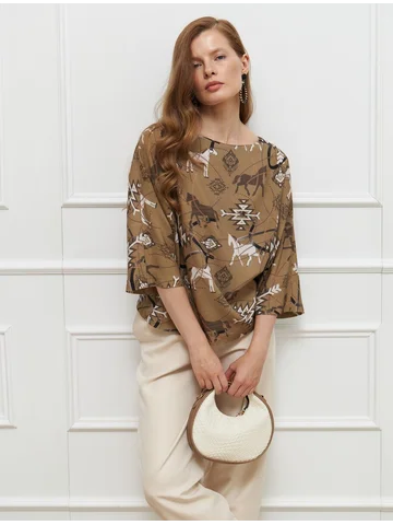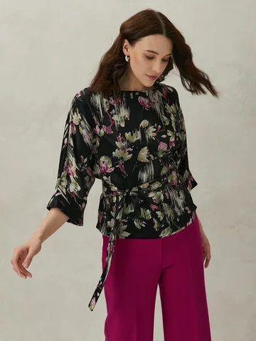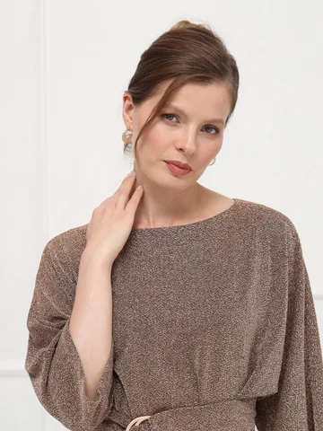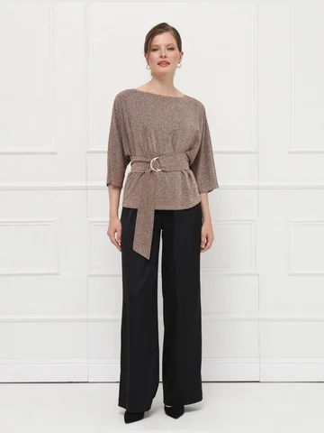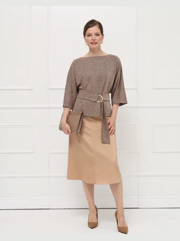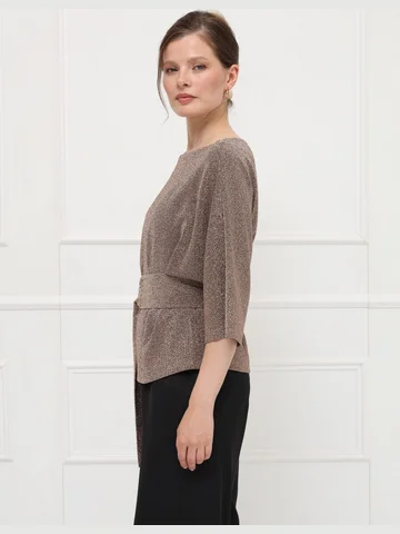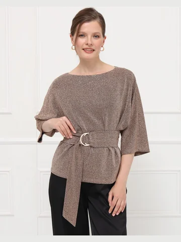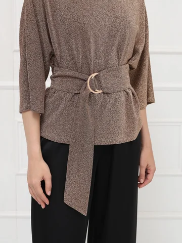 Элегантная блузка из тонкого эластичного трикотажа с деликатным золотым мерцанием мягко струится по фигуре. Цельнокроеные рукава 7/8 и лаконичная горловина подчеркивают изящество модели. Широкий пояс с декоративной пряжкой акцентирует талию и создает женственный силуэт.