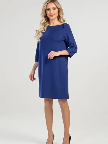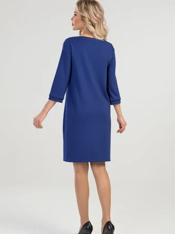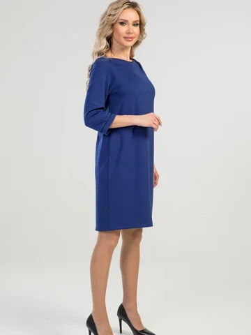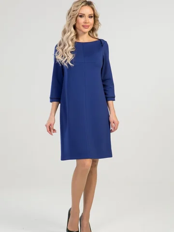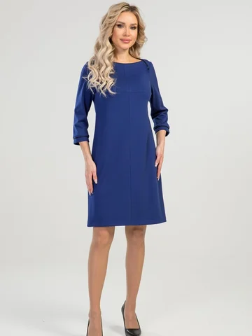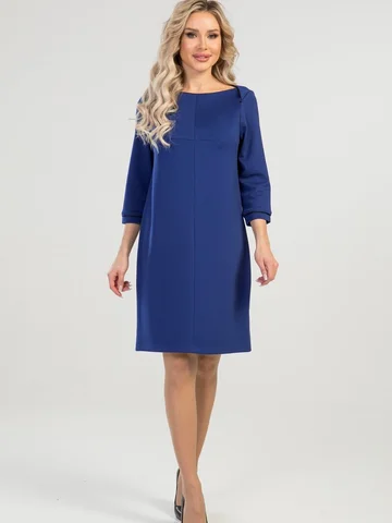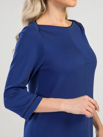 Платье А-силуэта выполнено из плотного трикотажного полотна. Расцветка синий-электрик. Вырез горловины "лодочка". Декорировано кантом. Рукава 3/4 25 см. Без подклада. Без застежки. ДИ в 42-44 р 90 см, в 46-48 р 92 см, в 50-54 р 96 см.