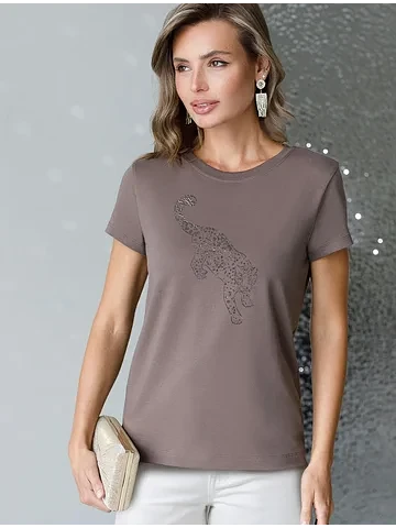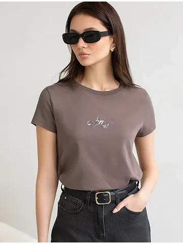 Здорово, что футболка получилась сидящей точно по фигуре. Материалы специально подобраны таким образом, чтобы дарить приятные ощущения коже и сохранять свежий вид надолго. А рисунок с легким блеском добавляет особую нотку элегантности вашему образу.