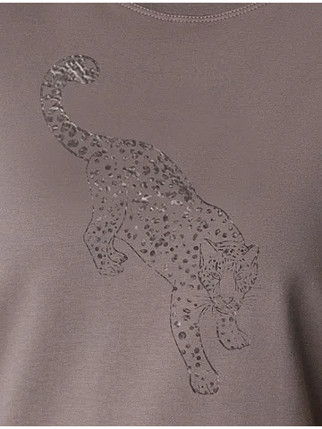 Стильная базовая футболка кофейного цвета с серебристым принтом фольгой выполнена из плотного хлопка с эластаном для комфортной посадки на любую фигуру. Прямая футболка классического кроя с круглым вырезом, прекрасно подходит для разных типов фигуры, в том числе и на большие размеры. Мягкость хлопка вместе с небольшой долей эластана гарантирует идеальную посадку и свободу движений. Легкая натуральная дышащая ткань премиального качества делает футболку с коротким рукавом идеальным вариантом для повседневной носки дома, на работу или офис. Однотонная футболка дополнена авторским аккуратным принтом с изображением леопарда, который придает праздничный и элегантный вид без лишней вычурности. Блестящий анималистичный принт аккуратно украшает, добавляя изысканный акцент и создавая легкий мерцающий эффект.