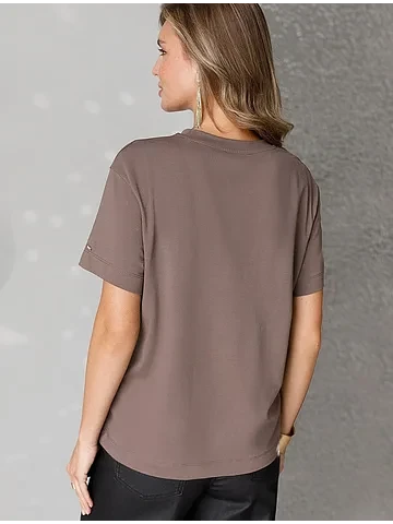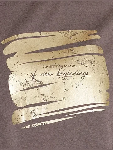 Стильная базовая футболка кофейного цвета с золотистым принтом фольгой выполнена из плотного хлопка с эластаном для комфортной посадки на любую фигуру. Прямая футболка классического кроя с круглым вырезом, прекрасно подходит для разных типов фигуры, в том числе и на большие размеры. Мягкость хлопка вместе с небольшой долей эластана гарантирует идеальную посадку и свободу движений. Легкая натуральная дышащая ткань премиального качества делает футболку с коротким рукавом идеальным вариантом для повседневной носки дома, на работу или офис. Однотонная футболка дополнена авторским аккуратным принтом с минималистичной надписью, который придает праздничный и элегантный вид без лишней вычурности. Блестящий принт аккуратно украшает, добавляя изысканный акцент и создавая легкий мерцающий эффект. Перевод надписи Trust the magic of new beginnings - Доверьтесь магии новых начинаний.