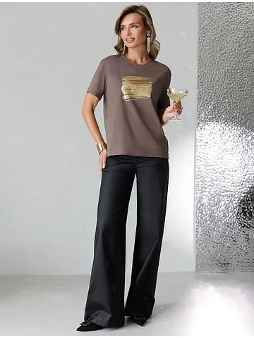 Эта эффектная футболка станет отличным выбором на праздник, подчеркивая образ сияющей и уверенной в себе девушки или женщины. Если вы ищете комфортный и одновременно привлекательный наряд для особых моментов, эта футболка станет надежным решением, подчеркивающим вашу индивидуальность и вкус.