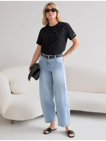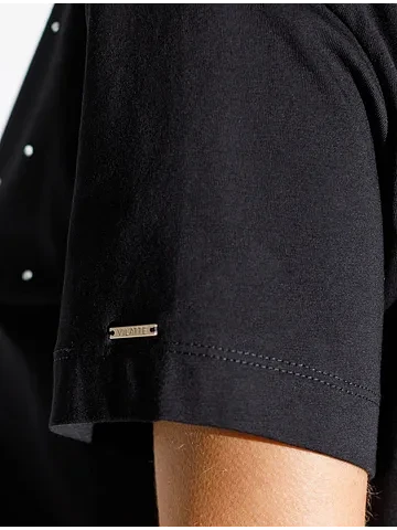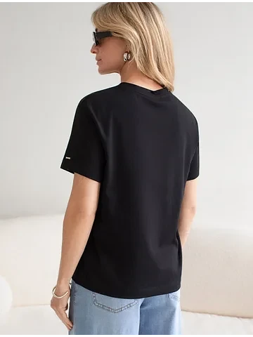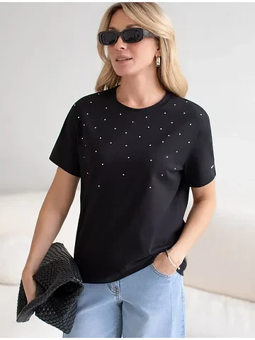 Стильная базовая футболка черного цвета с принтом стразами выполнена из плотного хлопка с эластаном для комфортной посадки на любую фигуру. Прямая футболка классического кроя с круглым вырезом, прекрасно подходит для разных типов фигуры, в том числе и на большие размеры. Мягкость хлопка вместе с небольшой долей эластана гарантирует идеальную посадку и свободу движений. Легкая натуральная дышащая ткань премиального качества делает футболку с коротким рукавом идеальным вариантом для повседневной носки дома, на работу или офис. Однотонная футболка дополнена авторским аккуратным принтом, который придает праздничный и элегантный вид без лишней вычурности. Блестящий принт в виде россыпи страз аккуратно украшает, добавляя изысканный акцент и создавая легкий мерцающий эффект.