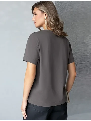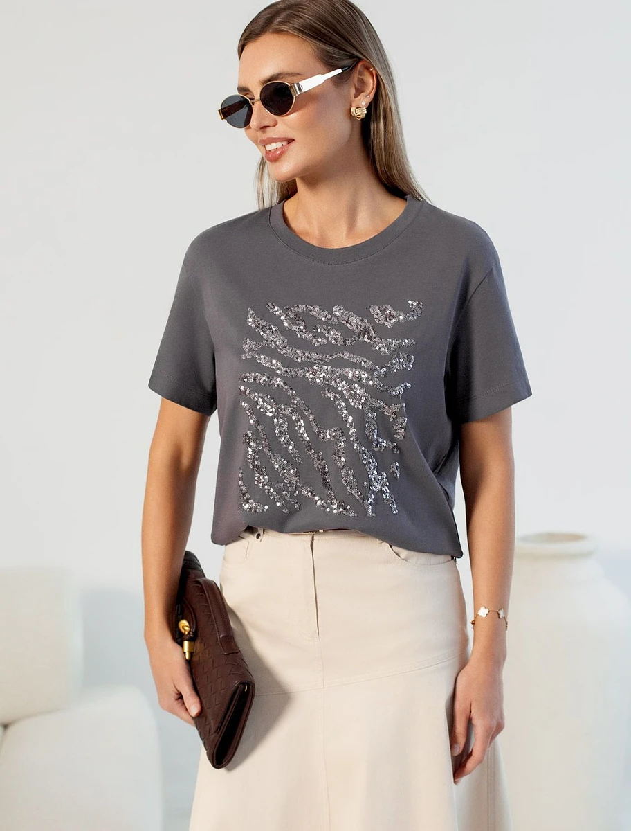 Стильная базовая футболка темно-серого цвета с серебристым принтом пайетками выполнена из плотного хлопка с эластаном для комфортной посадки на любую фигуру. Прямая футболка классического кроя с круглым вырезом, прекрасно подходит для разных типов фигуры, в том числе и на большие размеры. Мягкость хлопка вместе с небольшой долей эластана гарантирует идеальную посадку и свободу движений. Легкая натуральная дышащая ткань премиального качества делает футболку с коротким рукавом идеальным вариантом для повседневной носки дома, на работу или офис. Однотонная футболка дополнена авторским аккуратным принтом зебра, который придает праздничный и элегантный вид без лишней вычурности. Блестящий анималистичный принт аккуратно украшает, добавляя изысканный акцент и создавая легкий мерцающий эффект.