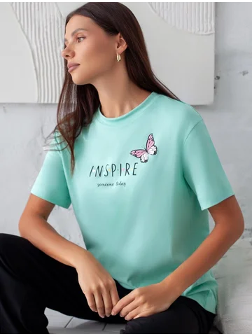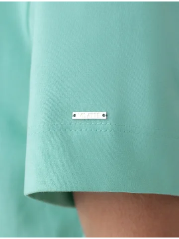 Футболка мятного цвета изготовлена из премиального хлопка с эластаном, она обеспечивает невероятное ощущение уюта и легкости. Натуральный материал сохраняет форму и цвет после множества стирок, обеспечивая долговечность изделия, а его высокая воздухопроницаемость создает ощущение свежести даже в течение долгого дня.