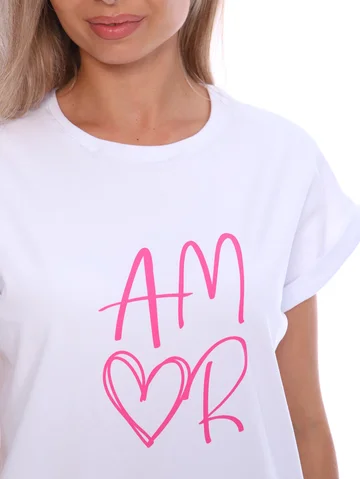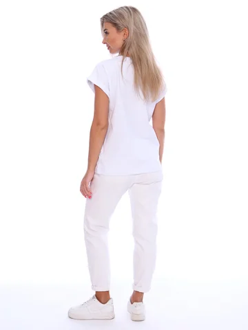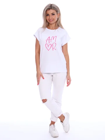 Футболка женская с оригинальным принтом, из хлопковой ткани с лайкрой. Ткань держит форму, не вытягивается, приятная на ощупь. Стильная футболка классического фасона со спущенным рукавом. Посадка свободная. Такая модель подойдет абсолютно всем и станет необходимой вещью в вашем гардеробе.