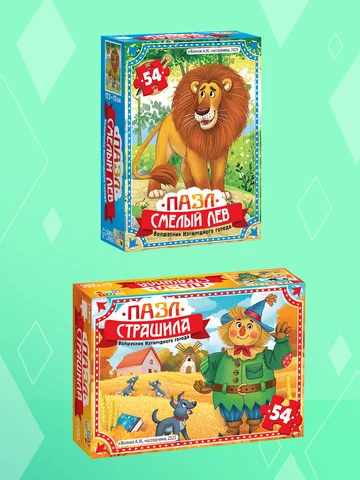 Пазлы «Волшебник изумрудного города», большой набор 10 в 1, 54 детали в каждом. Пазлы «Волшебник Изумрудного города» — это большой набор из 10 головоломок, каждая из которых состоит из 54 деталей. Этот классический набор создан для детей от 3 лет и перенесет ребенка в удивительный мир любимой истории про Элли, Страшилу, Железного Дровосека и других персонажей. Собирая пазлы, ребенок создаст яркие картинки, которые станут частью семейного досуга или украсят детскую комнату. Особенности