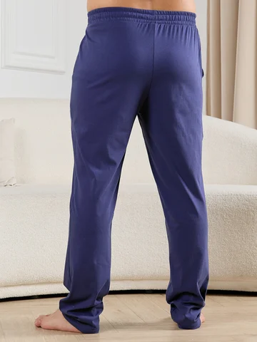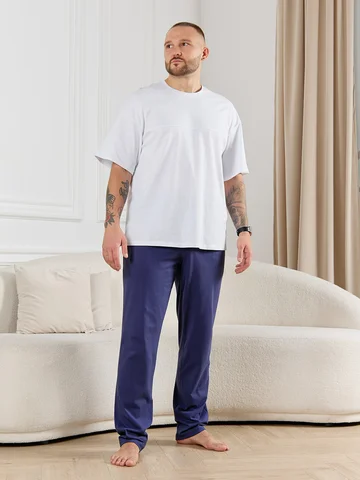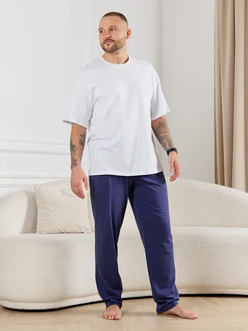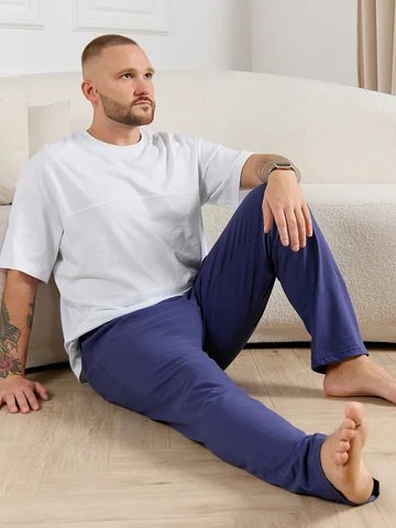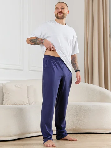 Брюки мужские из гладкокрашенго трикотажного полотна "кулирная гладь", свободного покроя, на притачном поясе с эластичной тесьмой внутри, с карманами в боковых швах. Нижние срезы обработаны подгибкой.