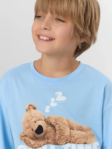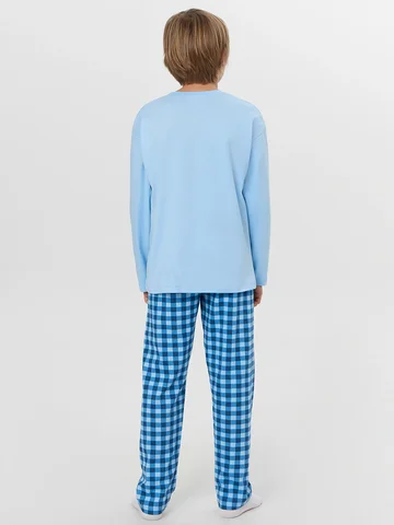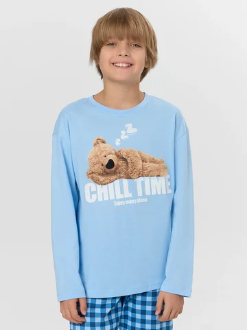 Голубая пижама для мальчиков с принтом и надписью создает атмосферу спокойного отдыха. Надпись «Время расслабляться. Наслаждайся каждым сном» передает философию здорового отдыха и напоминает о ценности качественного сна. Комплект из лонгслива и брюк выполнен из натурального хлопка, который обладает превосходными гигиеническими свойствами. Натуральный материал обеспечивает идеальную воздухопроницаемость, позволяя коже дышать на протяжении всей ночи. Хлопок отличается высокой гигроскопичностью, создавая комфортный микроклимат для тела.