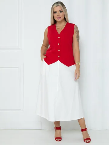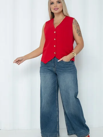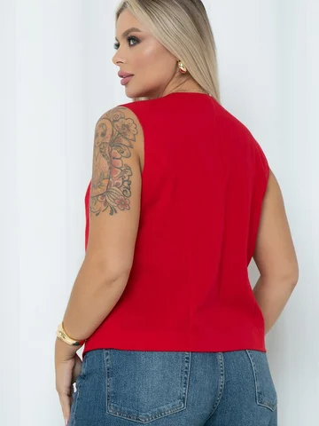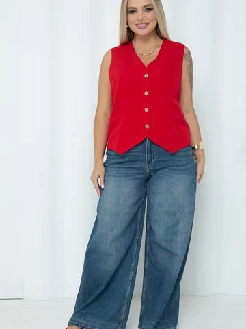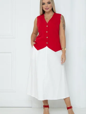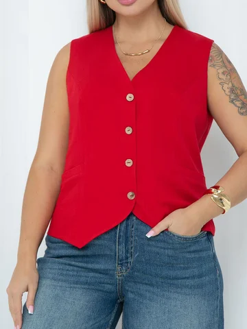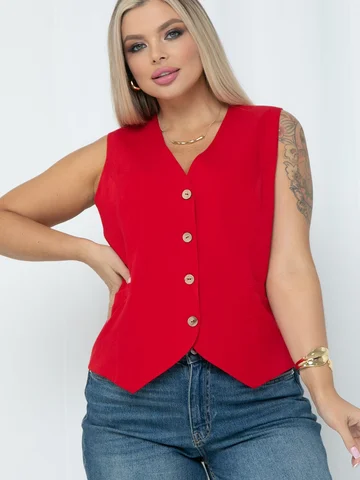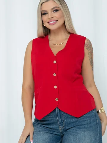 Жилет из ткани с льняной фактурой красного цвета. Модель полуприлегающего силуэта с рельефами по переду и спинке. Спинка с фигурной обтачкой. Рельефы переда декорированы листочкой. Полочка двойная с фигурным низом. Застежка на пуговицы из кокоса.