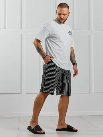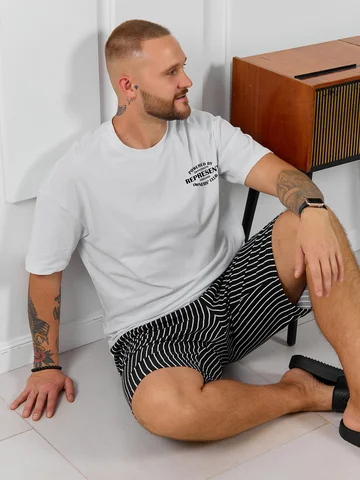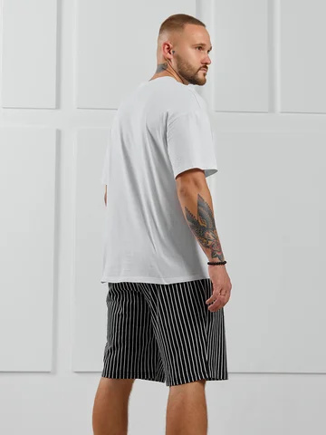 Костюм мужской, состоящий из футболки и шорт. Футболка однотонная с принтом на груди; модель свободная, со спущенной линией плеч. Шорты из полотна с набивным рисунком в узкую черно-белую полоску, с боковыми карманами с обтачными входами, на притачном поясе с отстроченной эластичной тесьмой.