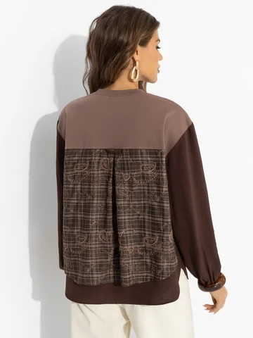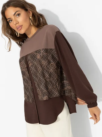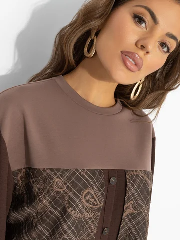 Фьюжн ‒ в офисном гардеробе! Этот свитшот прогоняет скуку серых будней: сочетание фактур, оттенков и узоров намекает, что смелость в стиле ‒ вещь только для взрослых. Любите эксперименты? Вам сюда. Свитшот из трикотажа в комбинации нескольких видов ткани. Гамма шоколадных оттенков, свободный крой.