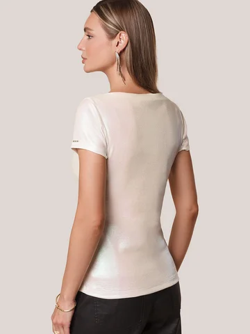 Повседневная футболка универсальна: она сочетается с джинсами, юбками или строгими брюками — легко создать как деловой образ для офиса, так и наряд для вечеринки или ужина вне дома. Матовое покрытие создает благородный блеск без лишней яркости, благодаря чему футболка смотрится свежо и актуально.