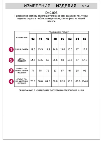 По данной модели предусмотрена отрицательная прибавка в обхватах, так как изделие изготовлено из эластичного трикотажного полотна, которое должно мягко облегать фигуру благодаря своему плетению типа резинки. Все размеры указаны исходя из состояния ткани без растяжения, что обеспечивает оптимальное прилегание к телу. Таким образом, данная модель соответствует заявленным размерам и идет точно "размер-в-размер".