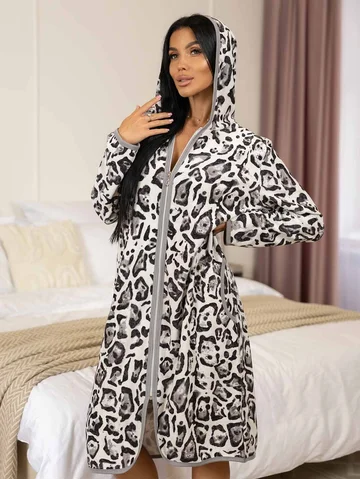 Теплый халат из турецкой облегченной махры на молнии с капюшоном и карманами, длиной до колена. Контрастная отделка по краю капюшона, борту, низу и краю рукавов.