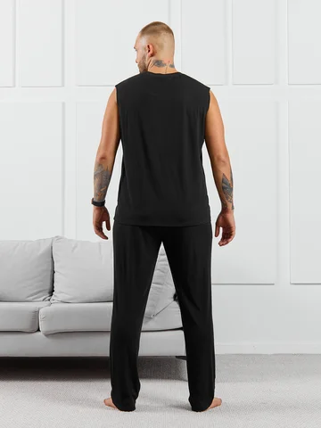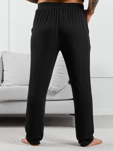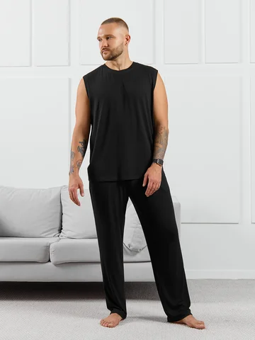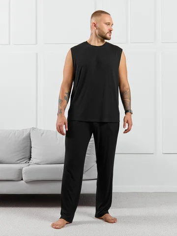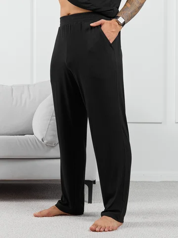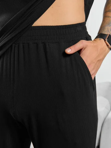 Брюки мужские из пластичного однотонного трикотажного полотна в рубчик, приятного к телу. Модель свободная, прямого силуэта, с боковыми карманами с обтачными входами, на притачном поясе с отстроченной эластичной тесьмой.