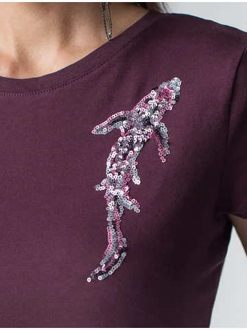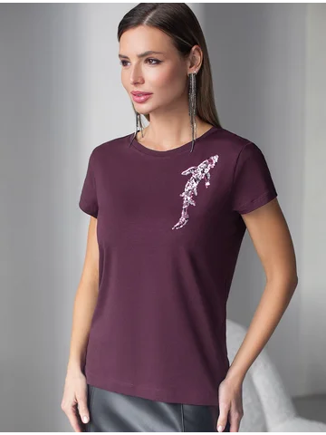 Футболка цвета бургунди идеально подходит для вечеринки и создания яркого образа. Оригинальный принт из ярких пайеток в виде рыбки придает изделию шикарный вид, который привлечет внимание на любом мероприятии. Модель с круглым вырезом и классическим коротким рукавом обеспечивает свободу движений и комфорт в носке. Такой фасон изделия подходит на большие размеры, гармонично сидит на фигуре и помогает создать легкий акцент на достоинствах. Аккуратный круглый вырез красиво подчеркивает шею и делает образ элегантным, сохраняя актуальность для разных случаев — от рабочих встреч до вечерних прогулок и праздничных мероприятий.