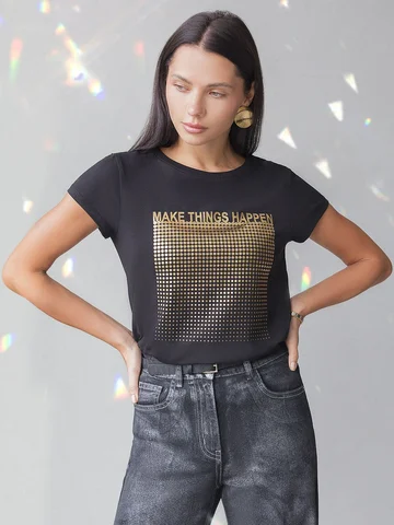 Эта нарядная футболка подходит для создания образа на каждый день и идеально подойдет на выход. Модель не мнется, что делает ее практичным вариантом для активных женщин, которые ценят стиль и удобство.