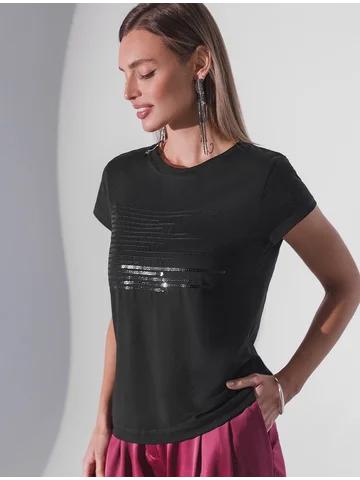 Футболка черного цвета идеально подходит для вечеринки и создания яркого образа. Оригинальный принт из пайеток придает изделию шикарный вид, который привлечет внимание на любом мероприятии. Модель с круглым вырезом и классическим коротким рукавом обеспечивает свободу движений и комфорт в носке. Такой фасон изделия подходит на большие размеры, гармонично сидит на фигуре и помогает создать легкий акцент на достоинствах. Аккуратный круглый вырез красиво подчеркивает шею и делает образ элегантным, сохраняя актуальность для разных случаев — от рабочих встреч до вечерних прогулок и праздничных мероприятий.