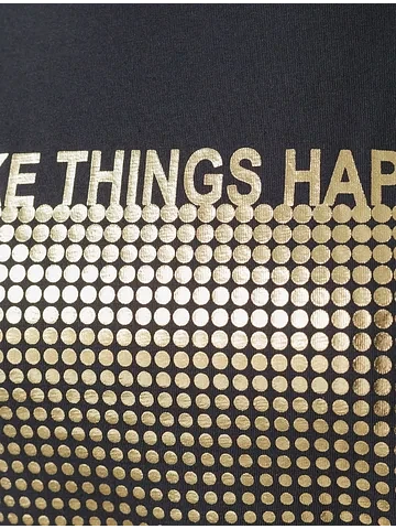 Футболка черного цвета идеально подходит для вечеринки и создания яркого образа. Оригинальный принт из фольги золотистого цвета придает изделию шикарный вид, который привлечет внимание на любом мероприятии. Модель с круглым вырезом и классическим коротким рукавом обеспечивает свободу движений и комфорт в носке. Такой фасон изделия подходит на большие размеры, гармонично сидит на фигуре и помогает создать легкий акцент на достоинствах. Аккуратный круглый вырез красиво подчеркивает шею и делает образ элегантным, сохраняя актуальность для разных случаев — от рабочих встреч до вечерних прогулок и праздничных мероприятий.