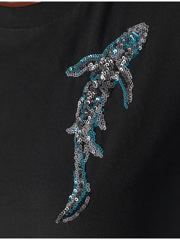 Футболка черного цвета идеально подходит для вечеринки и создания яркого образа. Оригинальный принт из серебристых пайеток в виде рыбки придает изделию шикарный вид, который привлечет внимание на любом мероприятии. Модель с круглым вырезом и классическим коротким рукавом обеспечивает свободу движений и комфорт в носке. Такой фасон изделия подходит на большие размеры, гармонично сидит на фигуре и помогает создать легкий акцент на достоинствах. Аккуратный круглый вырез красиво подчеркивает шею и делает образ элегантным, сохраняя актуальность для разных случаев — от рабочих встреч до вечерних прогулок и праздничных мероприятий.