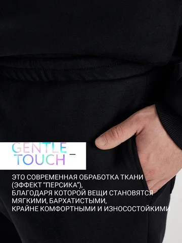 Черные теплые брюки из коллекции Gentle Touch — это современный комфорт для прохладных дней. Модель выполнена из инновационного футера с пич-эффектом, который создает на поверхности бархатистую, приятную на ощупь текстуру. Брюки прямого свободного кроя обеспечивают удобство и свободу движений. Пояс с эластичной тесьмой внутри дополнен продетым декоративным шнуром, что позволяет регулировать посадку. Удобные боковые карманы и накладной карман сзади добавляют практичности.
