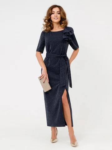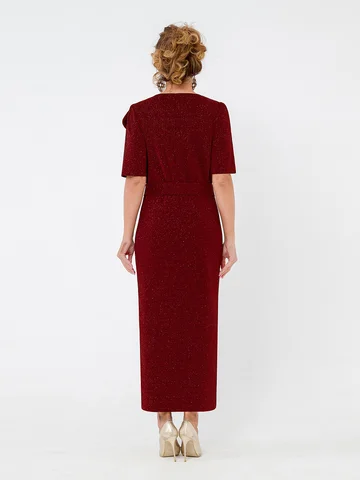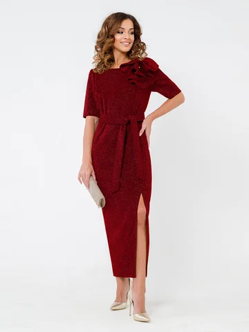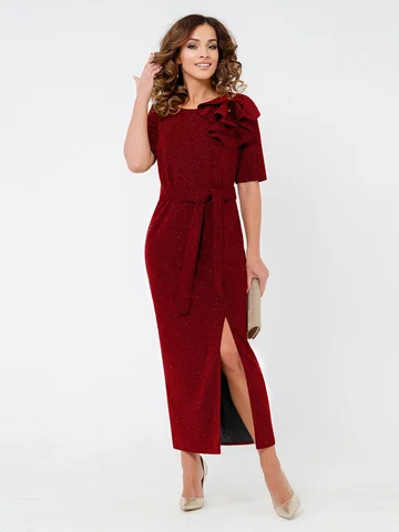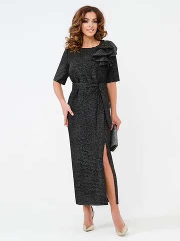 Встречайте изысканность и элегантность в одном изделии — женское вечернее праздничное платье с люрексом. Полуприлегающий покрой и шов сзади придают силуэту изящность, а разрез добавляет легкую нотку дерзости. Круглый вырез горловины и короткие рукава подчеркивают женственность, а макси длина юбки делает образ завершенным. Главной изюминкой платья является отстегивающийся бант. Он легко крепится и снимается, что делает платье универсальным для разных случаев. Его изысканный дизайн позволяет легко трансформировать образ: Вы можете носить платье в лаконичном стиле, а можете добавить бант, чтобы создать эффектный вечерний наряд.