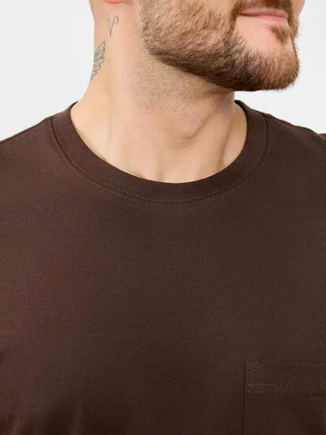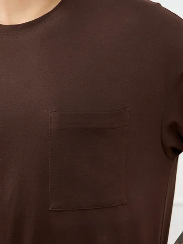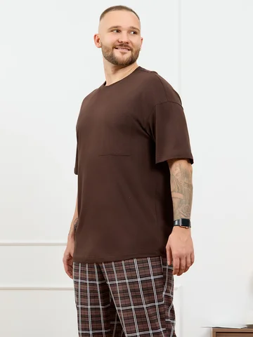 Костюм мужской из трикотажного полотна "кулирка", состоящий из футболки и брюк. Футболка классического покроя, с короткими втачными рукавами и приспущенной линией плеч, горловиной овальной формы, обработанной втачной планкой и нагрудным накладным карманом на детали переда. Нижние срезы рукавов и изделия обработаны подгибкой. По горловине настрочена отделочная строчка. Брюки - длинные, на притачном поясе с эластичной тесьмой внутри, с карманами в боковых швах. Нижние срезы обработаны подгибкой.