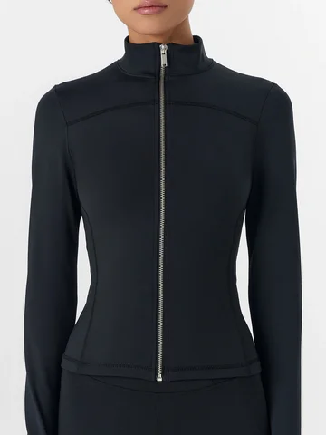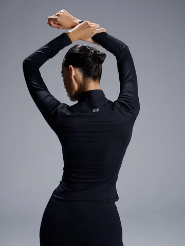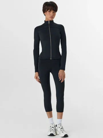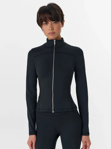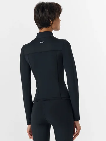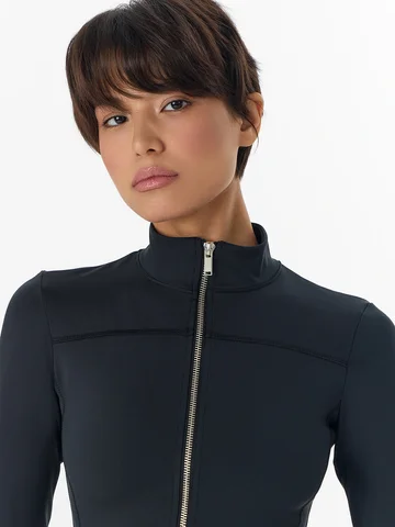 Черный женский спортивный жакет на молнии — это сочетание активного стиля и комфорта. Он выполнен из эластичного трикотажного материала, который хорошо тянется и не стесняет движений. Укороченный прилегающий силуэт с контрастными боковыми вставками и акцентными линиями швов создает современный, динамичный образ.