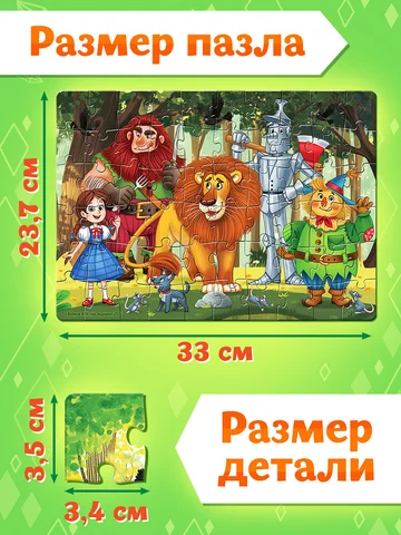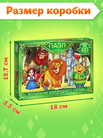 Пазл «Волшебник изумрудного города», 60 элементов. Этот пазл — как билет в знакомое приключение. Ребенок не просто собирает картинку — он снова встречается с Элли, Тотошей, Львом, Железным Дровосеком и Страшилой. Каждая деталь — шаг к Изумрудному городу, где важно не только добраться, но и понять, что самое ценное — это дружба, смелость и сердце. Почему дети выбирают этот пазл: