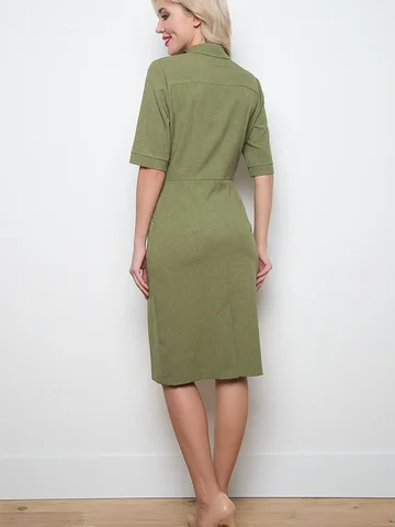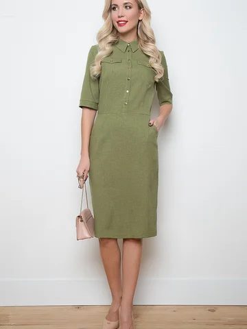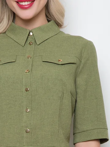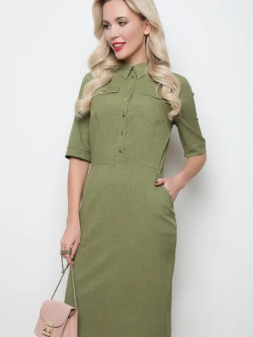 Платье-рубашка никогда не выходит из моды! Модель прилегающего силуэта из льняной ткани. Круглый вырез горловины дополнен рубашечным воротником. Перед дополнен декоративными клапанами и планкой до отрезной линии талии, с застежкой на петли и пуговицы. Спинка дополнена кокеткой. Спереди на уровне бедер расположены карманы с подрезным бочком. Короткие втачные рукава с притачными манжетами. В боковом шве застежка на потайную молнию.